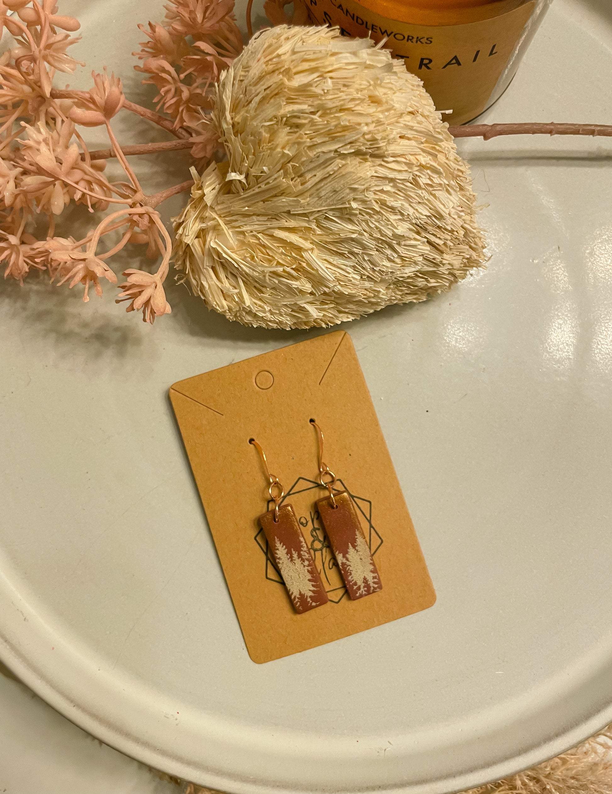 Rosewood clay with treelike silkscreen print and copper glazing on copper ear wire. All findings are nickel-free and hypoallergenic.