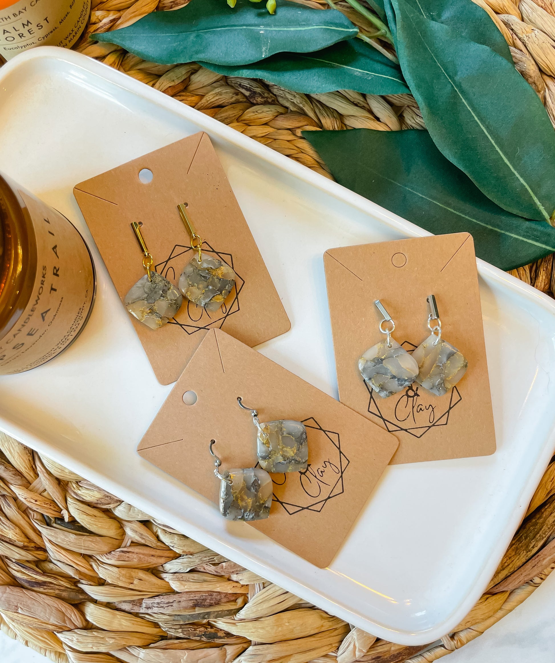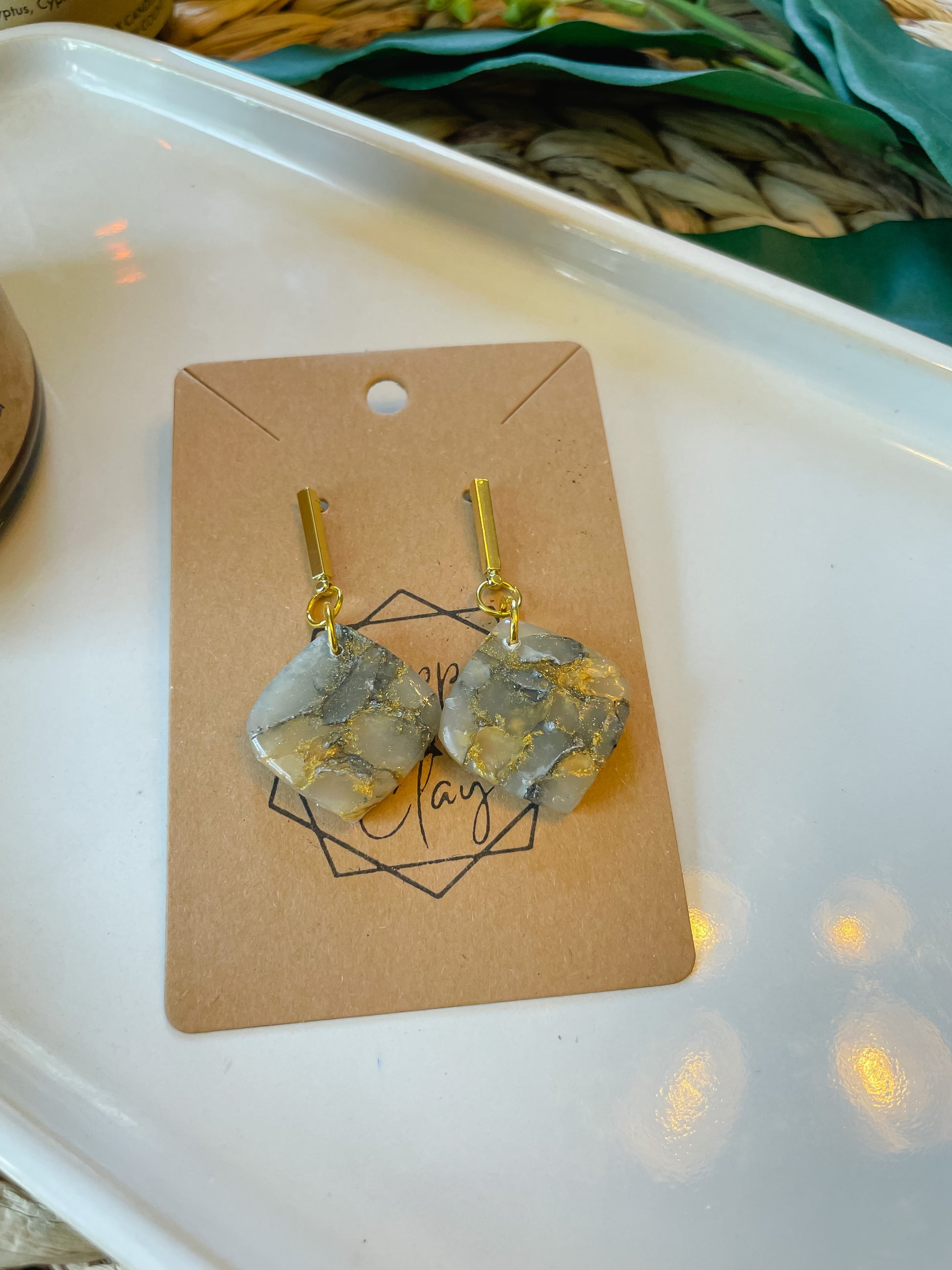 Faux stone with gold and graphite accents on brass or silver bar post stud or silver ear wire. Faux stone earrings vary in color, clarity, and design by nature and no two pieces are exactly alike. All findings are nickel-free and hypoallergenic.
